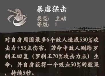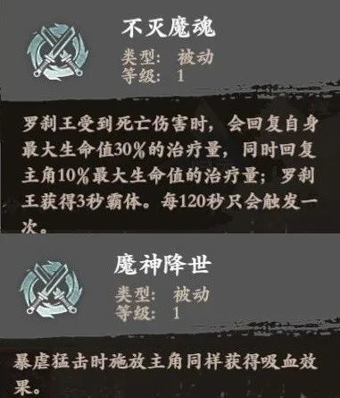 最后一个被动技能是罗刹王抗而不死的关键,不灭魔魂当罗刹王受到致命伤害的时候可以回复自身最大生命值30%,而且同时还能为我们的角色回复10%的生命值,罗刹王在附加3秒霸体不受敌人控制。那意味着什么?敌人辛辛苦苦干掉了罗刹王,但这才刚刚开始,罗刹王直接原地复活,嘲讽加吸血又变成了敌人面前的叹息之墙,只要撑过120秒,罗刹王将能再次复活,而敌人只能看着他高大的身躯陷入抓狂。