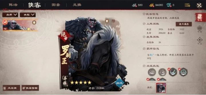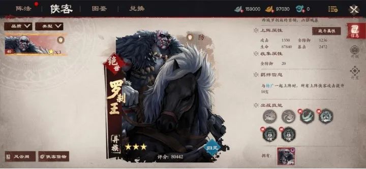 首先作为红色绝世品质的罗刹王,自身的属性那定是强大无比,在一级时与其他一级侠客的属性相比就要高出一大截,攻击力60点,全防御15,生命值3600,暴击点30,每一次等级提升会提升次角色2.5%的属性,成长性是相当的高啦,罗刹王在《镖人》手游中是防御型,一旦玩家拥有罗刹王那就等于拥有了一个肉盾,让这名恶鬼在玩家身前撑起一面铜钱铁壁。