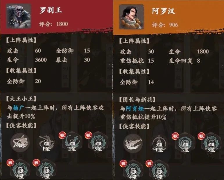 最后说两句:以上就是罗刹王的一下基础知识,还有在《镖人》中玩家可以最多上场四名侠客,每一名侠客都有着自己的羁绊人物,我们的罗刹王就和隋炀帝杨广有着羁绊,二者登场的时候可以提升全体侠客的攻击力,让罗刹王在防御本就高的同时输出也得到了保障,变得更肉更耐揍,毕竟罗刹王的二技能是可以触发攻击力吸血的,提升攻击力的羁绊怎样都不亏。这样异常能抗的罗刹王绝对是玩家在冒险途中值得信赖的伙伴,好好培养他,让他成为敌人望而却步的叹息之墙。