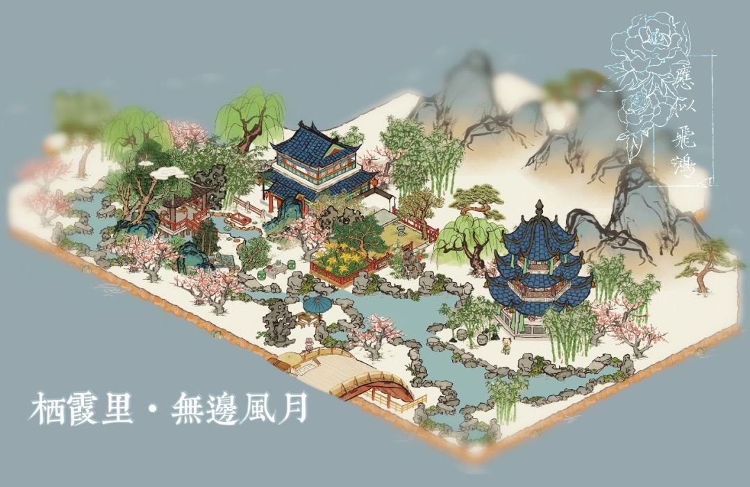 罗素月来应天府闲住时的居所,她会在这里给孩子们教课。油树林掩映住书院古怪的大门,造成曲径通幽之感,小径连通人工湖的留白做为道路,宗祠当做罗素月清修之处。