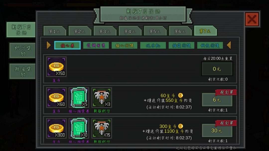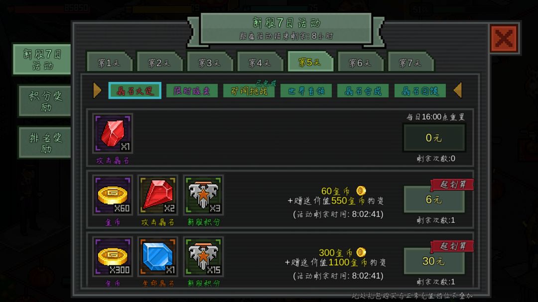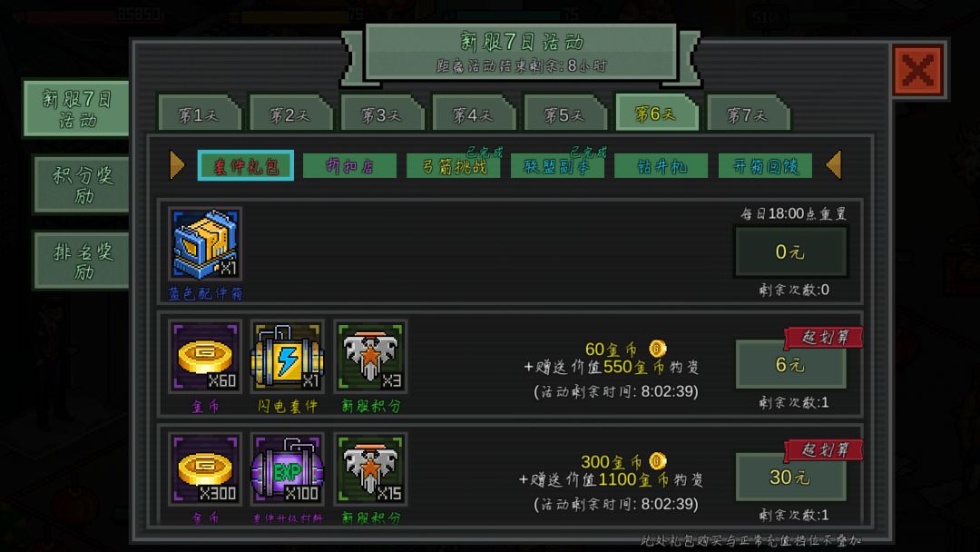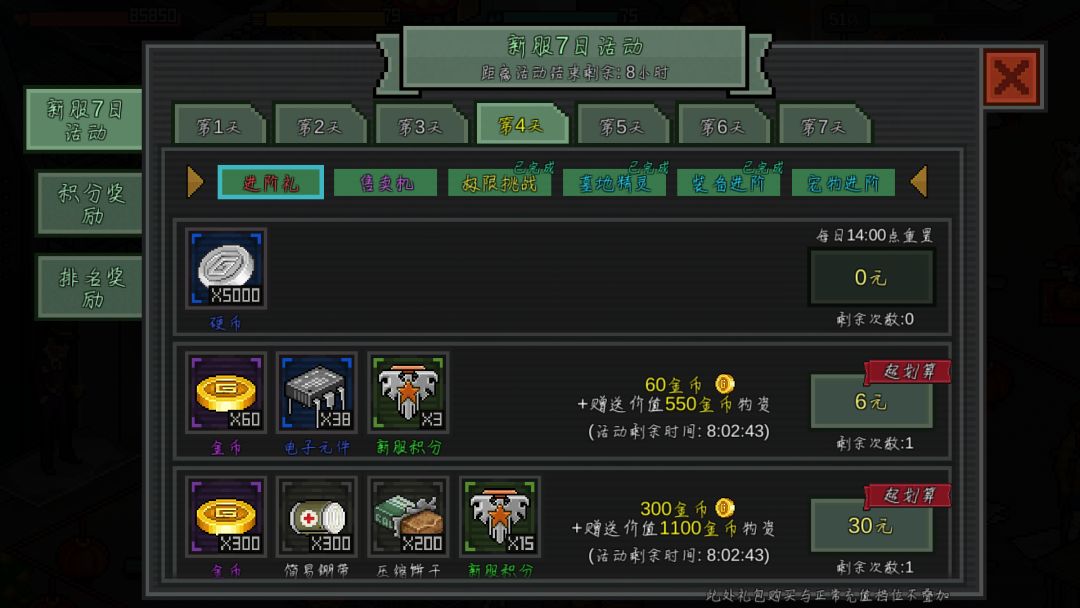 第三点,因为那个七日活动比较鸡肋,比如第四天的装备进阶,宠物进阶,如果前三天就做了,是不计入其中的,这些我会在后面的避雷中细说。
