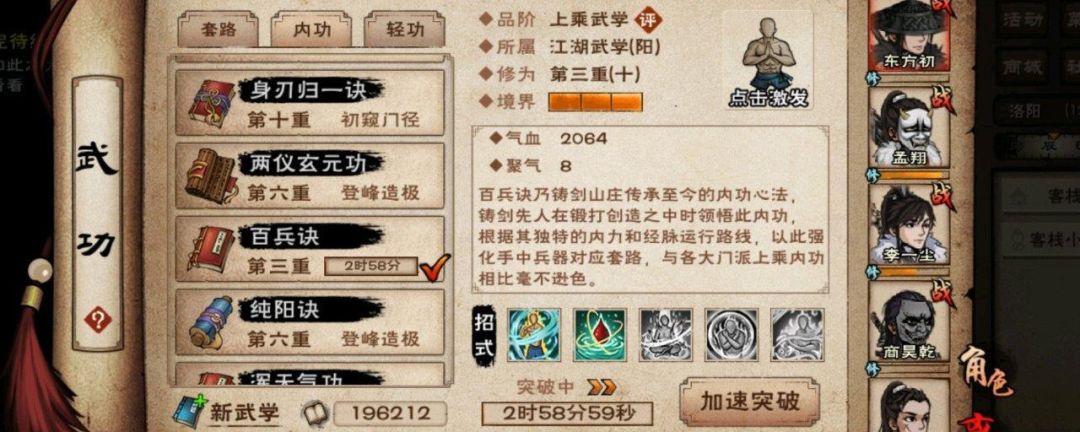 一技能内劲,可以提高攻击力,影响属性为内息。