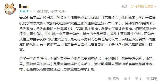 相比之下,国内评论也同样认可《尼尔》手游的画面、音乐和剧情等等,但却提出了一个观点:如果不是很关注剧情的话,不建议玩。