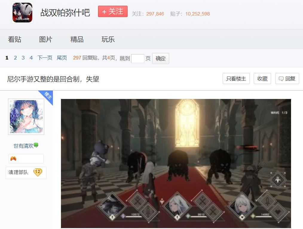 在战双、崩坏3等游戏的贴吧中,也可以看到关于《尼尔》手游的讨论。对其回合制的玩法设定表示失望的占多数,有部分玩家表示也能接受回合制玩法,但仍旧认为《尼尔》手游不做ACT就很离谱……只有少量的玩家表示“可以试试看”,能比得了阴阳师和FGO就行。