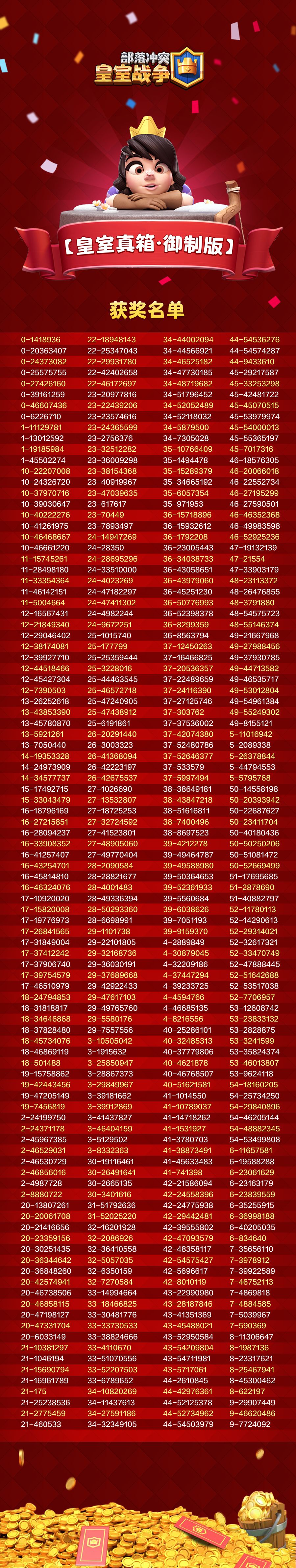 获奖名单由Supercell从所有满足100皇冠要求,且账号创建地为中国大陆地区的挑战者中随机抽取(活动期间获得主题季限定“紫禁瑞兽”皇家塔皮肤则自动获得额外2次抽奖机会)。