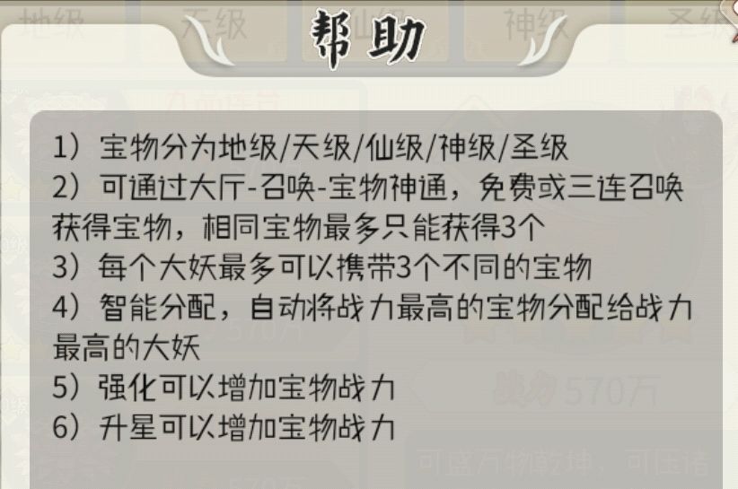 宝物是加战力的一大关键,共分为地,天,仙,神,圣五大级,有6种颜色,分别是黑,绿,蓝,紫,橙,红。最多有三个相同的宝物。