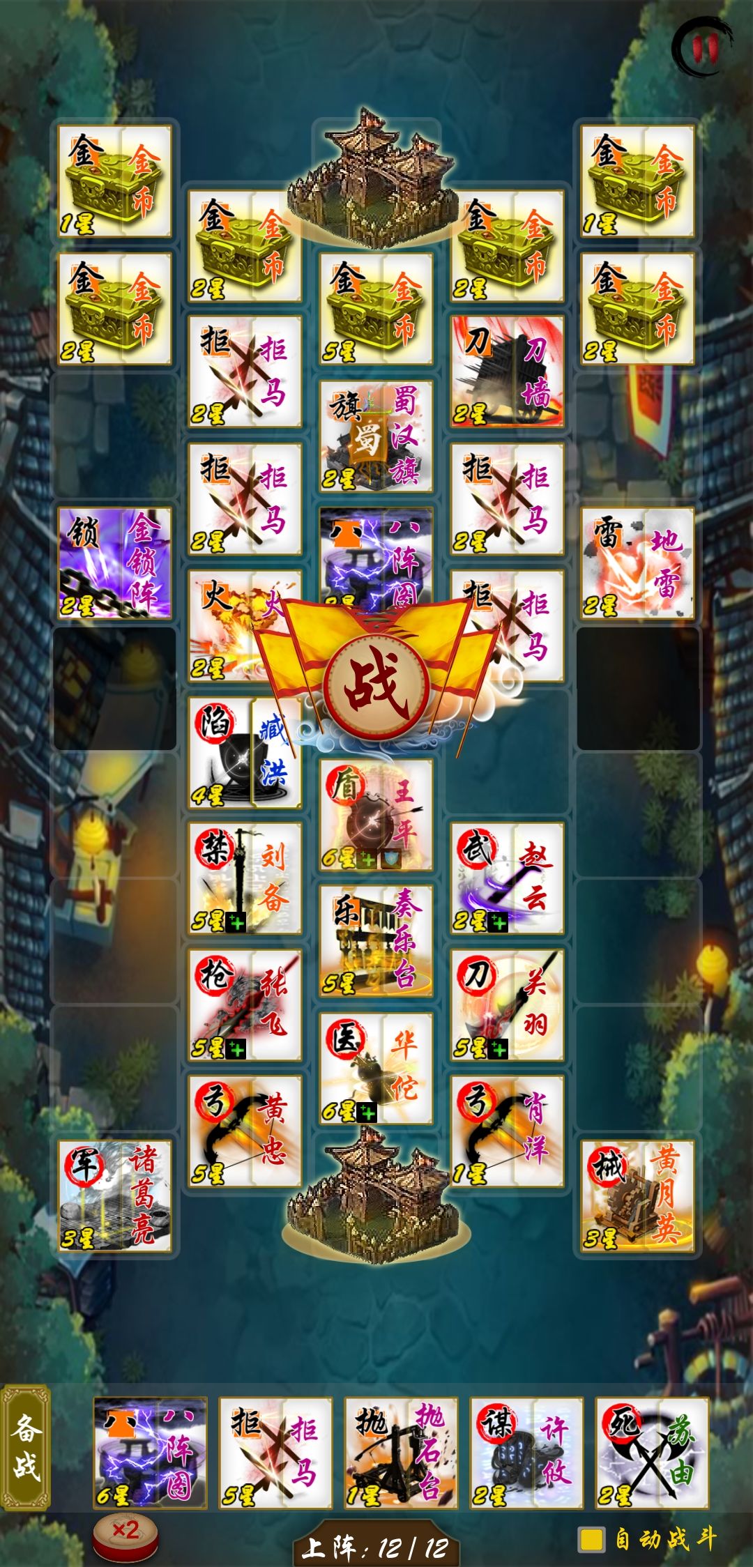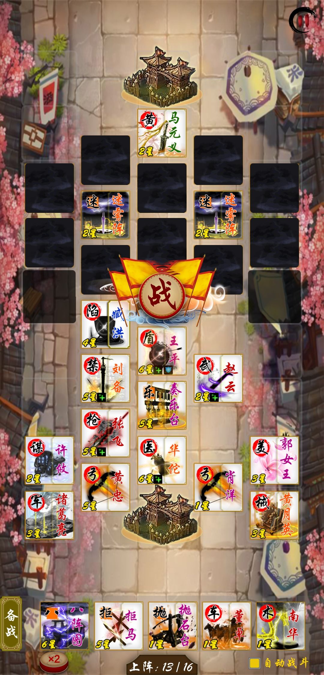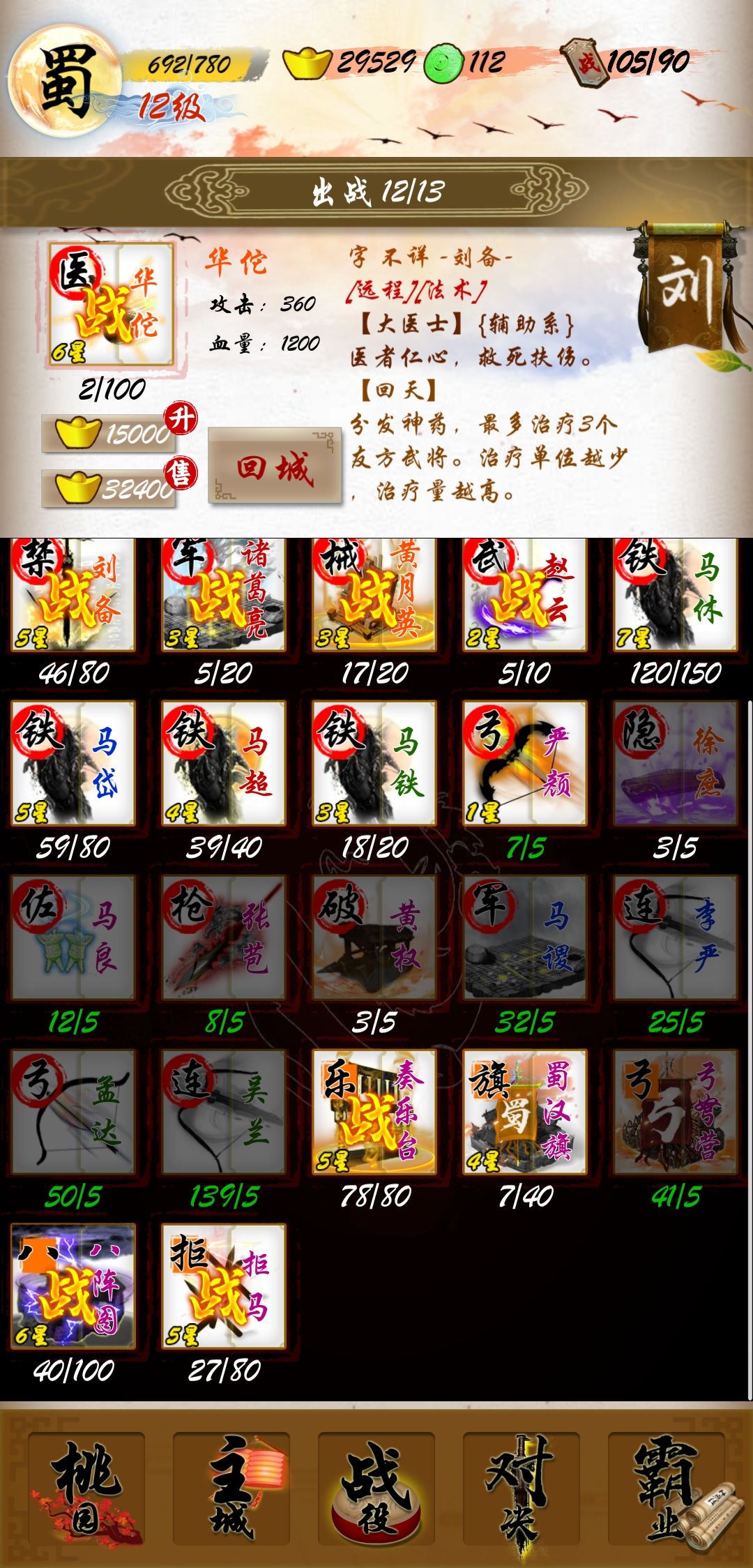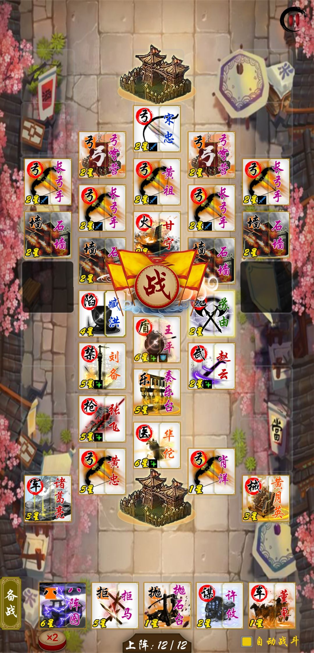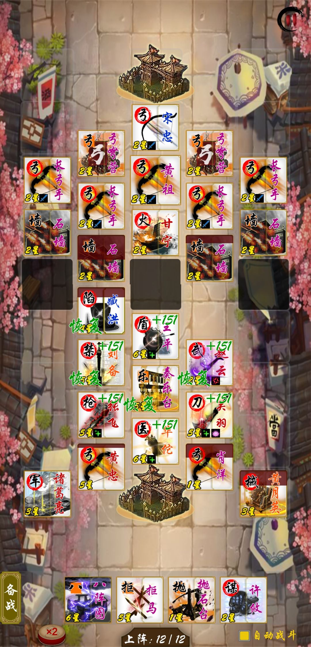 首先是练度,我的等级低不过签到了一段时间所以还看得过去。但是由于出战位太少所以不用铁骑流,就带最基本的12个东西,如果等级比我还低就减掉拒马八卦黄月英。