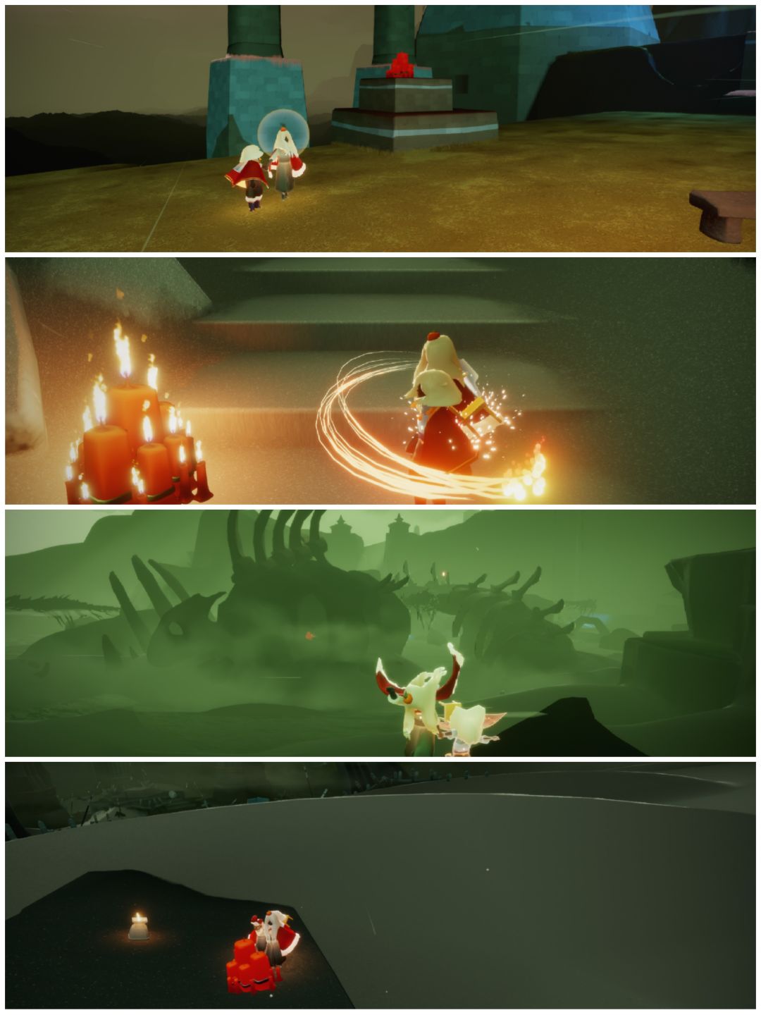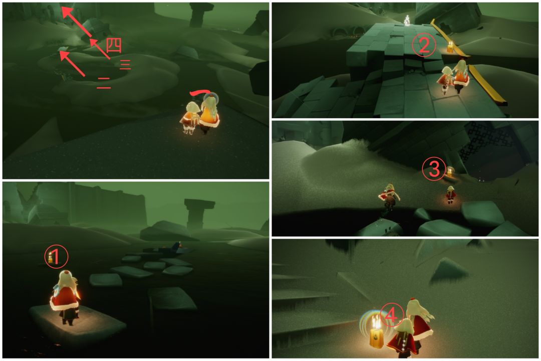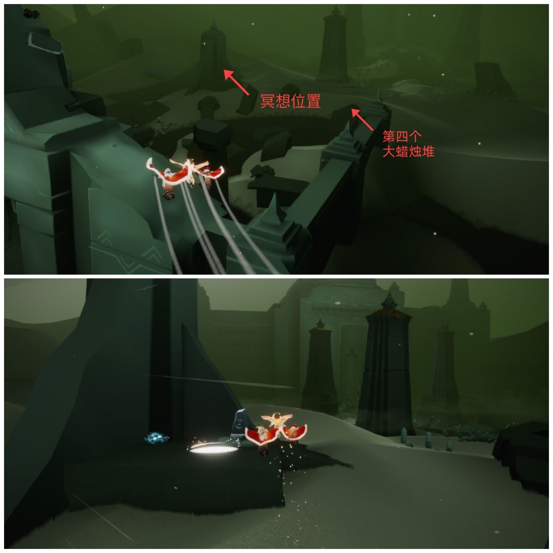 6.每日大蜡烛堆位置,分别在墓土大厅回头看看柱子、进一龙图门口、四龙图的山洞里记得躲避龙、最后一堆在三龙图(也就是终点那个)冥想右飞就能看到