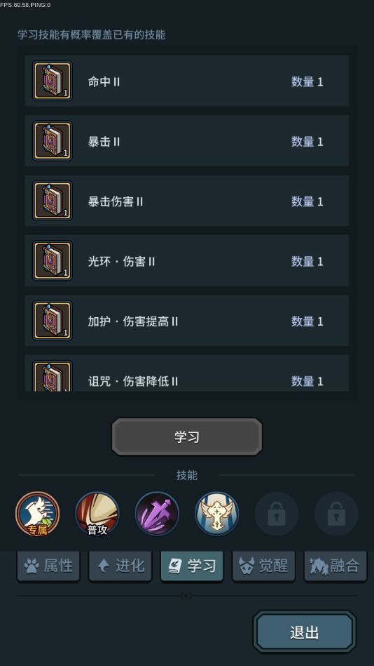 宠物详情栏点开,学习功能已经解锁,这时候如果你有技能书的话,就可以直接点击学习了~宠物有四个可学习技能栏,后两个是锁着的,必须通过融合打开,这个后面开启再说;前两个技能建议可以直接随便学习,因为融合还有可能顶技能,所以这时候别想太多,学就完事儿了。(当然是学你想养的宠,毕竟分解不给技能书返还的)