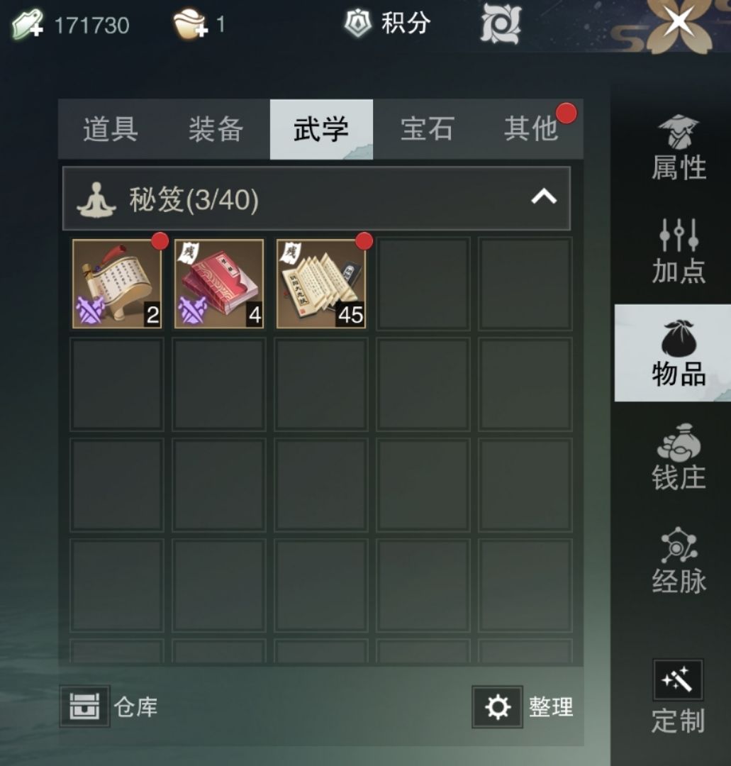第二种,开出中级金,同理自己需要就留着,不需要的话,去市场看价格,如果这个中级金卖出去能买三本紫秘籍还有余的话可以出手,如果卖出去买不了三本紫秘籍就继续换积分。