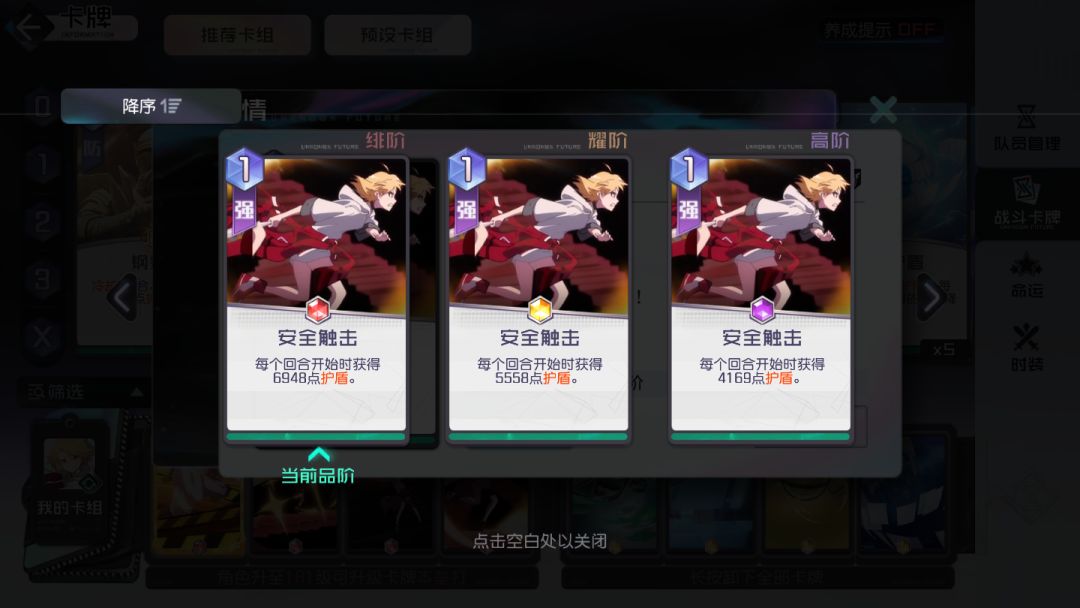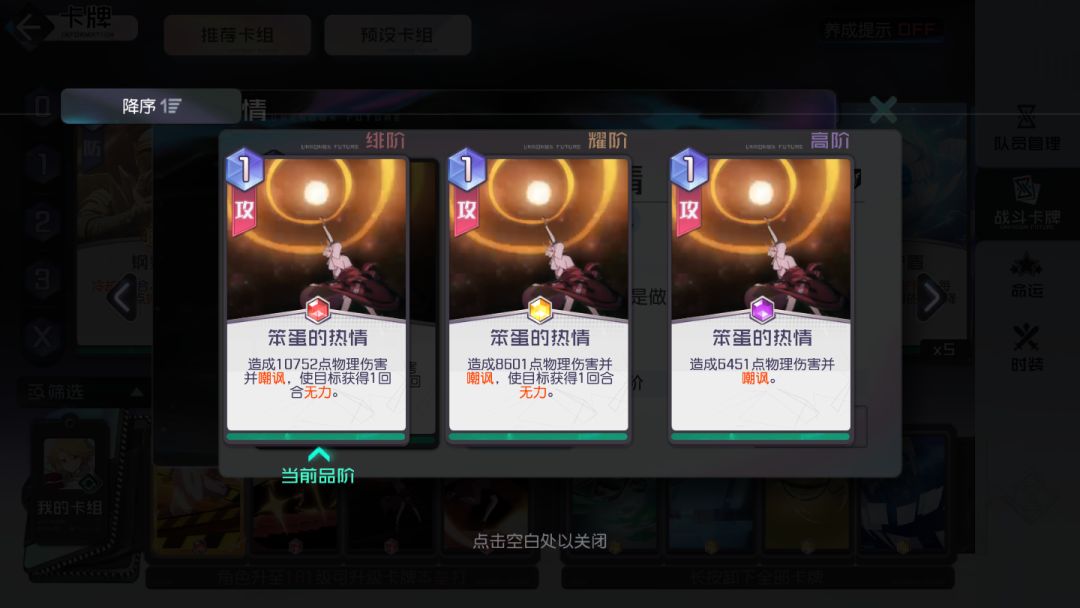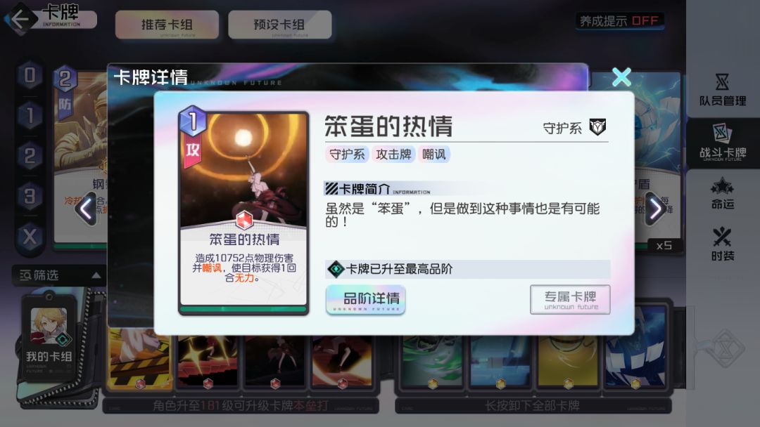 在PVP战斗中,胜利的关键在输出的存活情况,诺的重生使敌方无法快速秒杀。为了保护输出,棒球妹的终结技以及卡牌的嘲讽能都可以有效遏制敌方伤害能力。即使后期嘲讽失误,棒球妹的攻击卡牌同样可以对敌方造成致命的伤害。支援系的佐伊换成其他支援系同样也可以。