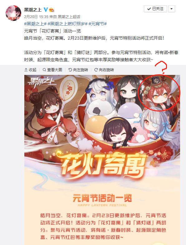 这张元宵节的海报上面除了赤姬(左一开始)、贝鲁卡、艾尔莎、白鹭、未来后面那个Q版角色你可认识?