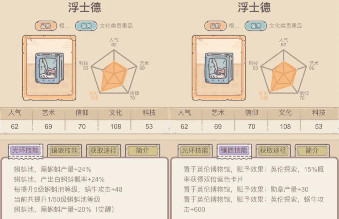 偏向于资源获取,目前环境,有很多玩家对黑蝌蚪需求还是非常大,满星浮士德可以增产黑蝌蚪24%,觉醒浮士德还可以继续增产黑蝌蚪20%
