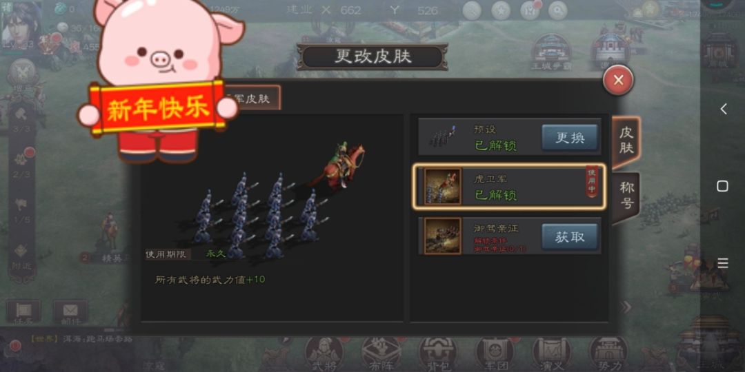 不知不觉中《三国志威力无双》开服了一个月,记得公测第一天(2021年1月14日)小米发了一条短信说我预约的《三国志威力无双》公测了,我怀着十分激动的心情马上点击链接下载了游戏,注册进入了游戏,由于第一天开了十三个区,想到很多大佬都是玩一区的,作为一个萌新还是选了后面一点的区(五区)按步骤开始游戏,由于是第一次玩这类型游戏,新手指引很重要,我就跟着新手指引一直玩下去,因为前期不会玩,充了点小钱加上活动的元宝,基本都在求贤所招募武将用光了,第一次开始试水玩,发现这是个养成类游戏急不得,得慢慢玩,所以认真玩了三天,等到周末有空决定去下一个新区(24服:白衣渡江)重新开始。很喜欢玩养成类游戏,所以进新区就打算长期玩下去了,开区就买了个至尊月卡,买了橙色装备,到军威五拿到了那个虎卫军行军皮肤(所有武将的武力值+10)如图,当然那个咸阳宫皮肤也超级帅,属性也好,但本人不是大佬开区没拿下来:
