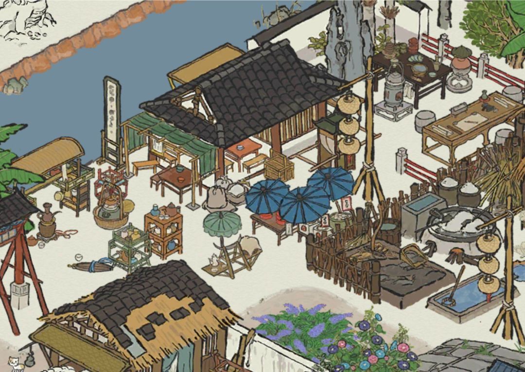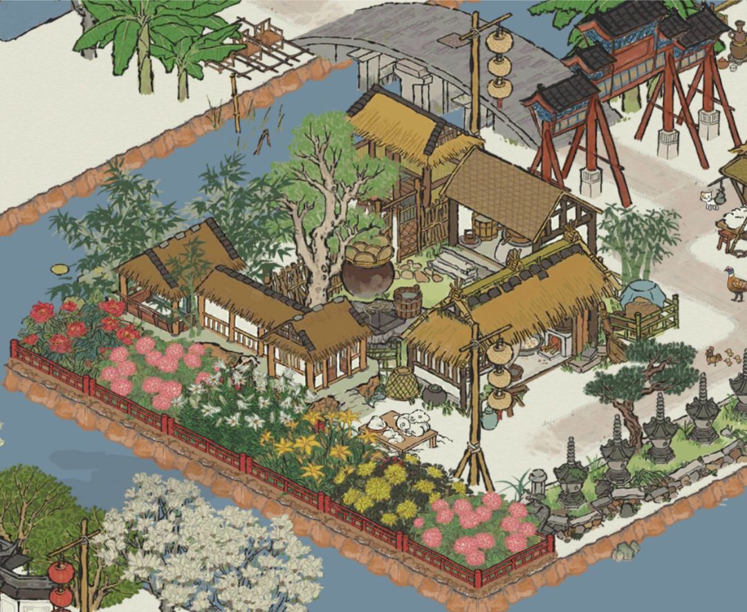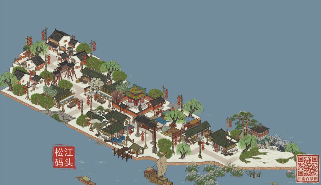 码头闹市,看到天妃宫的地方就是家~为了符合介绍放了天妃宫,换成茶楼集市也可。只升了一个五级标布店,90补天石,另外粮油店升五级80石头,鞋履店100石头。标布店升五级还挺好看,高了一层而且多了一颗松树和一个蓝色小棚