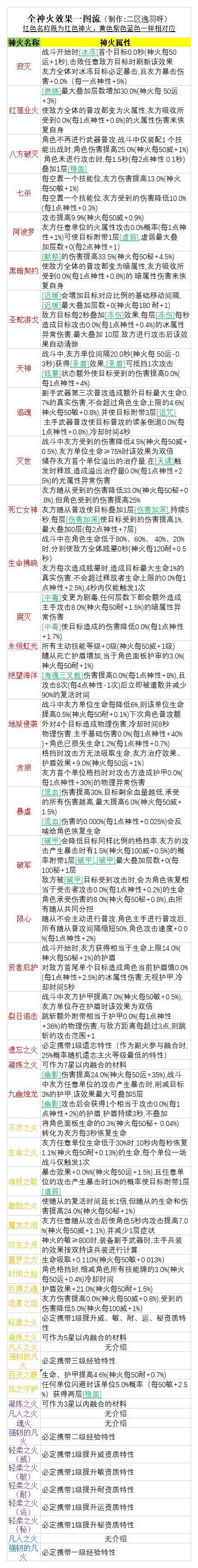 本帖子由本人(二区 逸羽呀)及操劳(郊区一区)还有其他小伙伴共同完成,主要是将目前所有的神火及特性进行了收集整理(可能不完全),并制作成了一图流,其实也是自己图个方便,需要的可以直接保存,本帖子会持续更新。