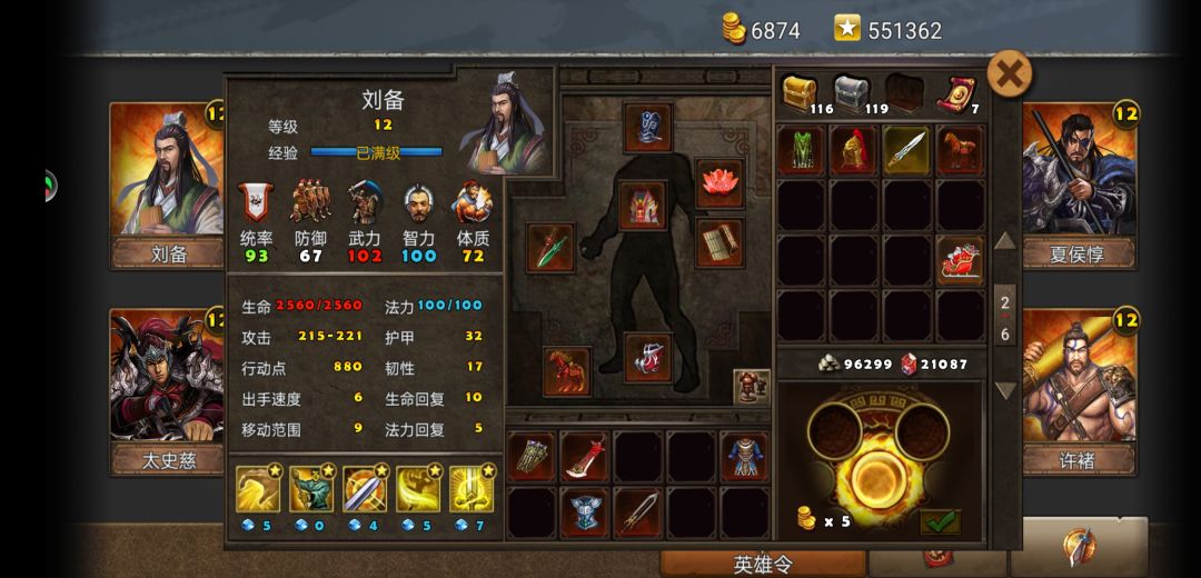 刘备装备如上,戏法必备,或者12速以上,推荐戏法。12速以上必须牺牲雌雄了。马也推荐用赤兔。