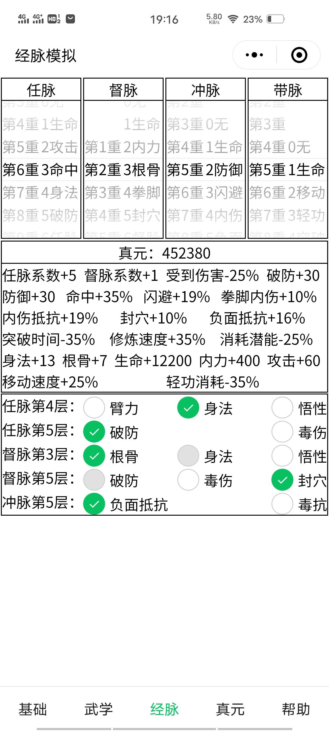 我这边留下我加点的思路,5.1带是因为我秀菊准备走匹配的路线,而且准备600基础轻功,5.1比4.1能省很多潜能。我之所以放弃督脉,任脉点到6.3是因为秀菊是高爆发武学。开局能一套打残对方。所以我极限任脉保持输出。我未2轮有5800内力,也是2级督脉,轮回后应该有6000+内力,天地绣才500内力,所以不缺内力消耗,
