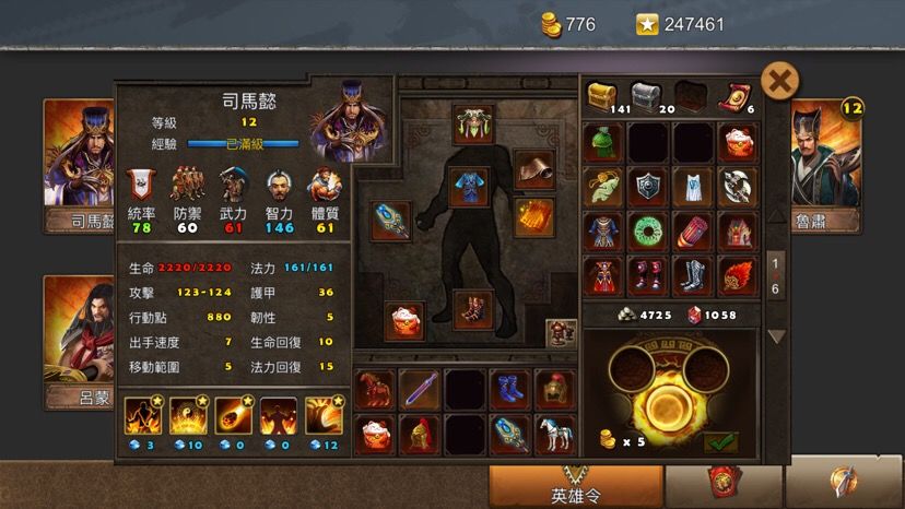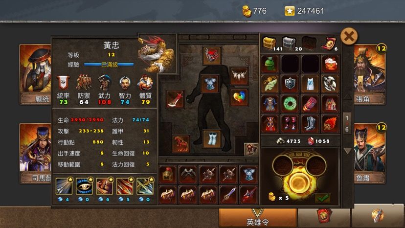 装备稍微好点的带人的,上黄忠司马懿。装备如图所示。司马懿雷仗必须带,隐身避免第三关被减蓝。黄忠血煞套,灵法鞋换虎鞋啥的也行,两英雄手速方面没特殊要求。除了必须装备其他可以上更好的,相信大家只会比这装备更好。