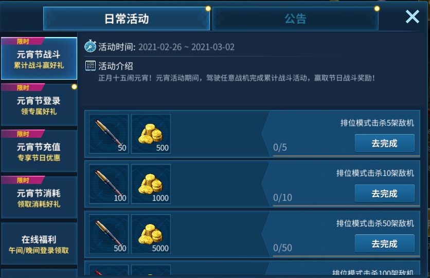 正月十五闹元宵!元宵活动期间,驾驶任意战机完成累计战斗活动,赢取节日战斗奖励!