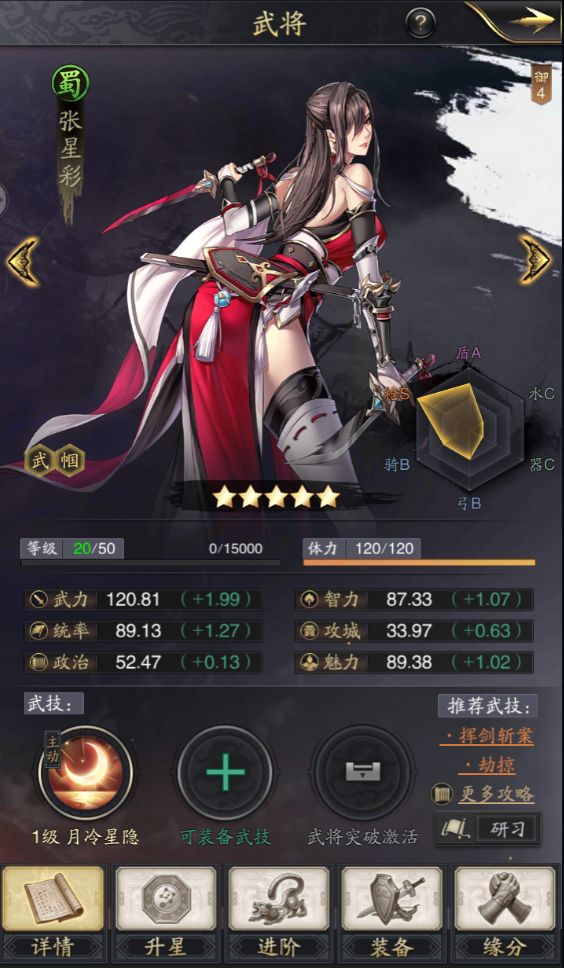 马云禄掌中雪剑冰气逼人,使其他队友每2~5次普通攻击,恢复兵力治疗率35%(武力加成);当任一敌军单体兵力低于70%时,其他队友每普攻攻击1次,马云禄获得一柄霜枪,身后集齐5把霜枪时,将对兵力最低的敌军单体造成183%武力攻击的斩杀(如果目标未阵亡则斩杀失败,直接恢复2柄霜枪)