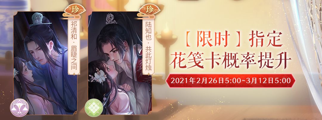 活动期间,祁清和珍品花笺-【眉睫之间】、陆知也珍品花笺-【共此灯烛】获得概率提升,详细请查阅游戏内卡池公告。