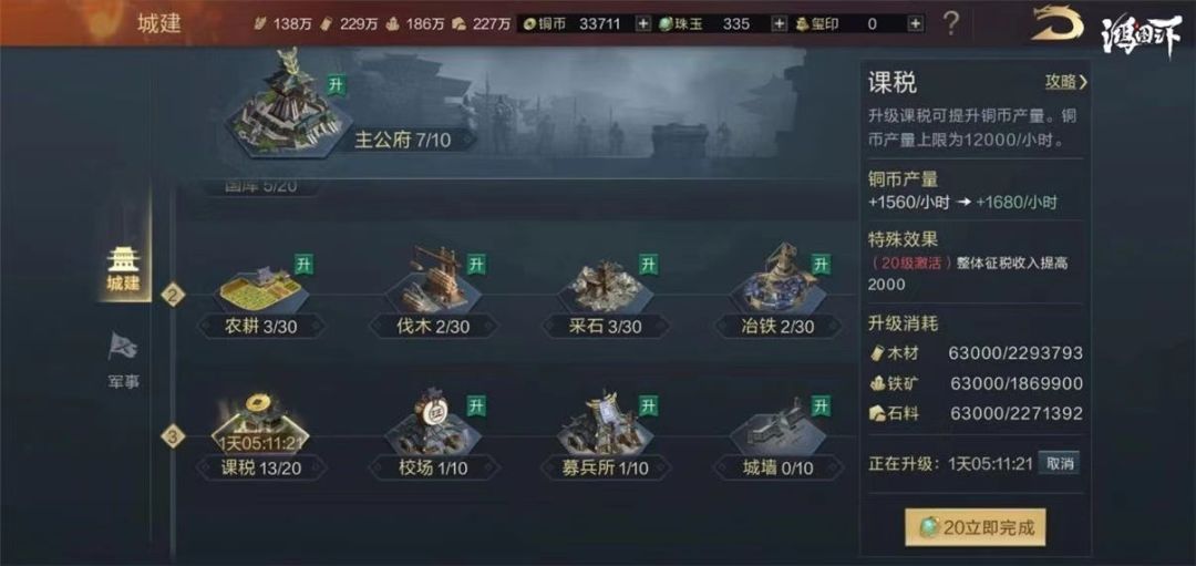 分营中的课税在升级后虽然无法征税,但可再次提升每小时的铜币产量和主城征税的数量,最高可达1.2W/小时。此外,每日还可进行四次征税,城池每天就能为主公提供43W铜币,相当于1000余次铜币抽卡,可获得一万武技点和若干紫卡、蓝卡,便于赛季内中后期的武技升级,并囤积满红紫卡以便在新赛季快速兑换武技点。