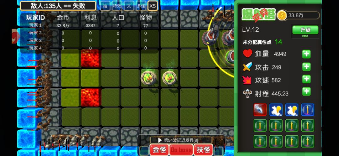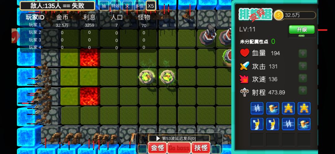 上面两个塔输出能输出到50波(为了测试我只用了8个格子)