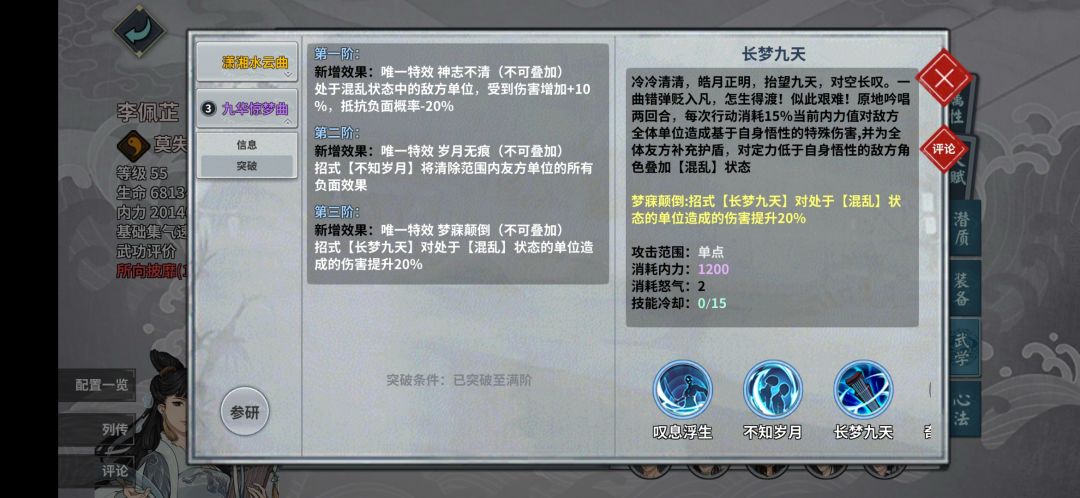 因为银珊星河逆转有100开局cd,2.5银珊40 80 120时序才会使用逆转刷新,所以师姐40不知岁月80长梦九天持续到180时序,师姐120第一跳,银珊120时序刷新师姐并补充满集气,师姐125 165仍然在180时序九梦状态下进行第二第三跳,205时序第二轮不知岁月可以清一下敌阵中队友的负面,然后再来一次九天,高强制伤害加混乱干扰辅助,连超肉和尚这样血量低的会被大量强制伤害击杀(因为我主角黄天有大量强制伤害其余门派看着使用不一定能速杀和尚,我之前杀和尚一定要列缺连击打血,现在不一定要了)。