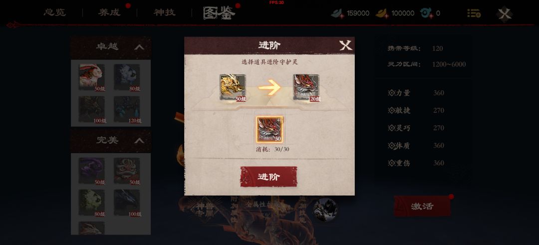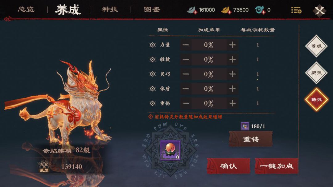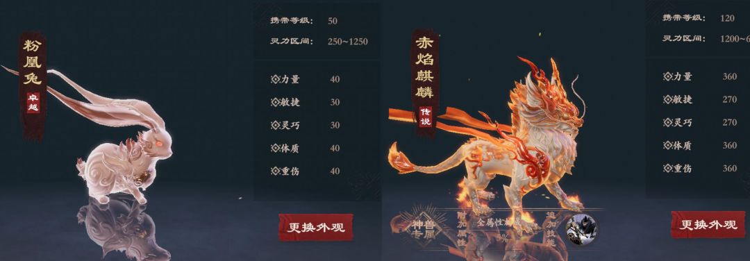 赤焰麒麟,守护觉醒再来看看赤焰麒麟的基本属性。在《镖人》手游中守护灵的品级分为三类:卓越、完美和传说,而我们的赤焰麒麟就是最高的传说品级,在一级的基础属性就要高出卓越品级的守护灵几个等级,例如一级的基础守护灵粉凰兔其属性为力量、体质、重伤均为40点,而赤焰麒麟的基础属性直接破百,力量、体质、重伤均为360点,敏捷与灵巧则有270点之多,灵力区间更是有着1200~6000之多,玩家在培养时灵力区间越高则属性与伤害的加成也就越高。这样超高的属性比最低品粉凰兔不知道高出多少,就连同为传说级赤日炎龙也要甘拜下风。