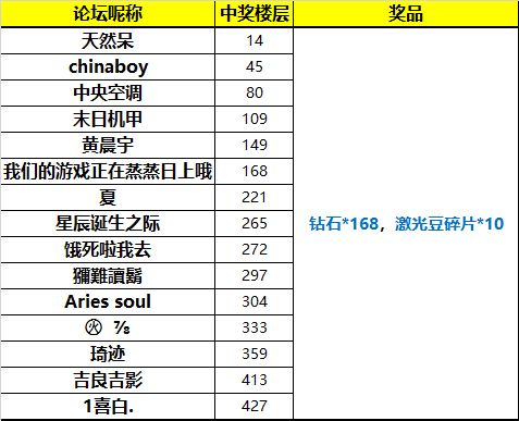 幸运奖15名,钻石*168,激光豆碎片*10