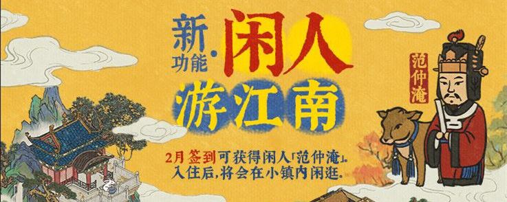 江南百景图中的闲人范仲淹是可以通过签到活动获得的,在签到获得闲人之后需要将其安排在特殊住宅里,如残雪楼园、广寒宫、半山阁、采药圃、浇花亭、孟母老宅等处,在入住之后闲人将会在小镇内闲逛,闲人是不能给其指派工作的,只能作为城市的装饰。范仲淹是闲人系统中推出的第一名角色,后续还会有其他闲人推出。