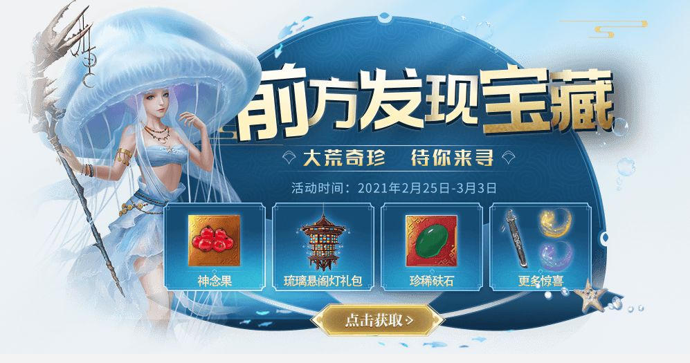 旅者们在2月25日10:00且版本更新后登陆游戏,就可以看到活动的弹窗提醒啦,就是下面的这张图~点击“点击获取”按钮即可跳转到活动页面~没点上怎么办呢?不用着急,旅者们打开【右上角菜单-福利-限时】页签,也能找到活动入口。