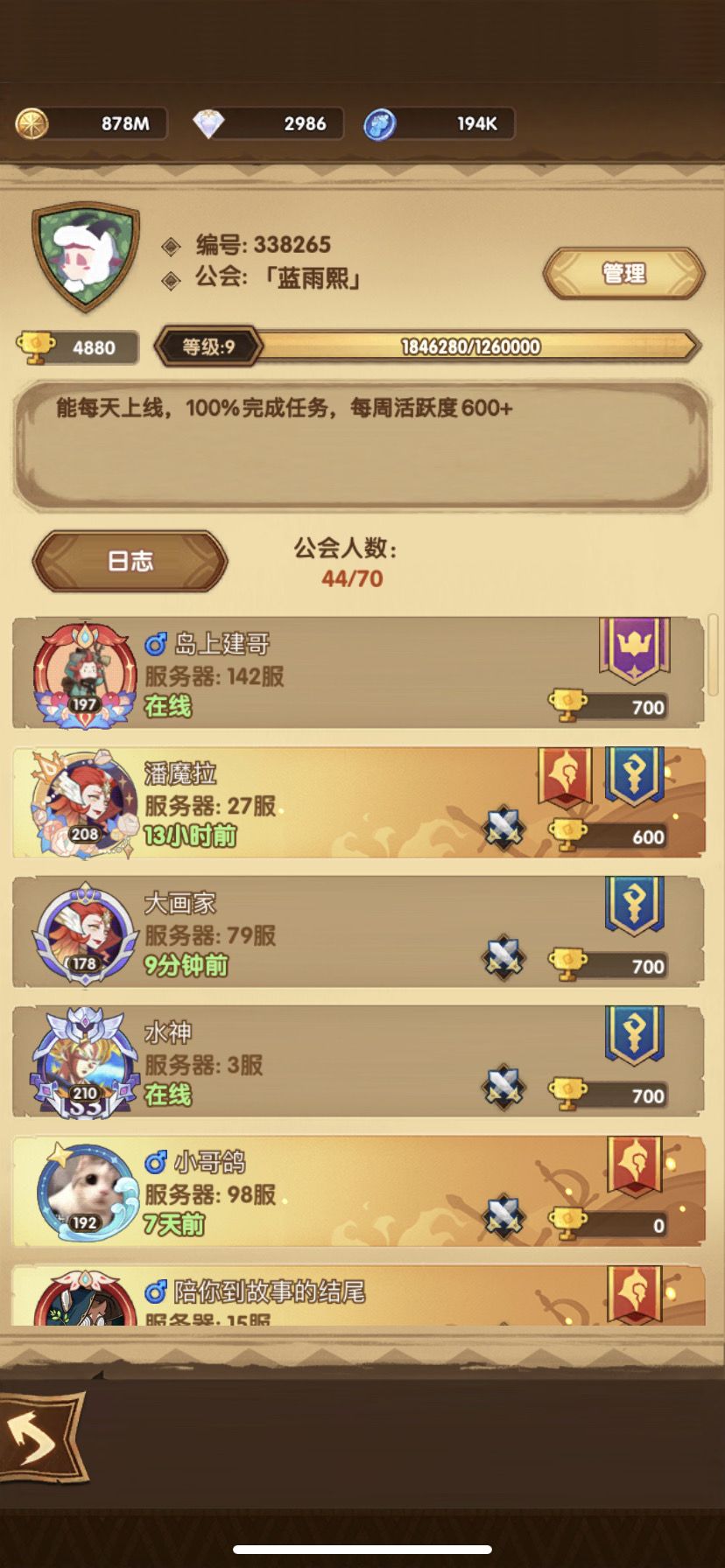 要求:不要求等级,只要能每天上线完成任务,每周活跃度600+即可