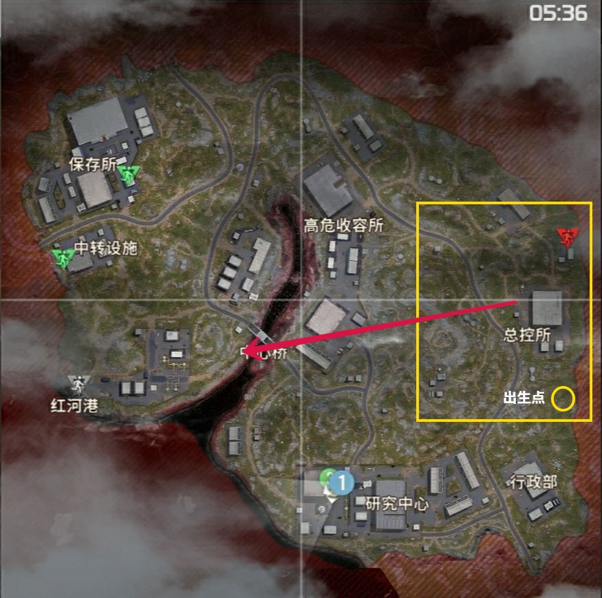 上图就是总控所搜刮后的撤离路线,一般我个人喜欢选择的是中心桥撤离点,3号区域虽然有撤离点,但是一般我们搜刮完后撤离点还没开启,所以说就近可以去中心桥的撤离点。中心桥的撤离点也有个好处,就是如果你在总控所搜刮的物资不够丰富,也可以选择在中心桥附近蹲伏敌人,获取大量物资。