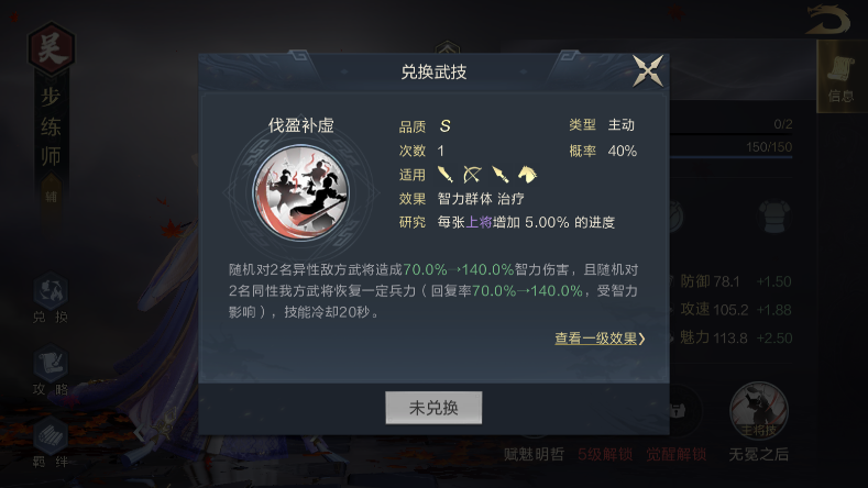 二技能:上步练师的兑换技能伐盈补虚为队伍增加伤害还可以为队伍恢复一定的兵力。