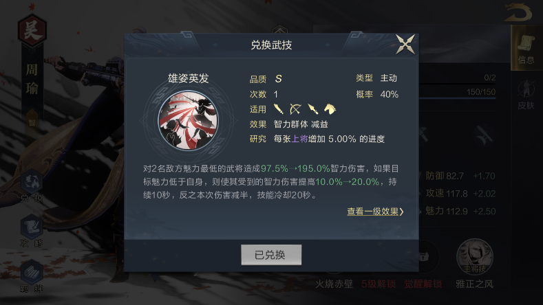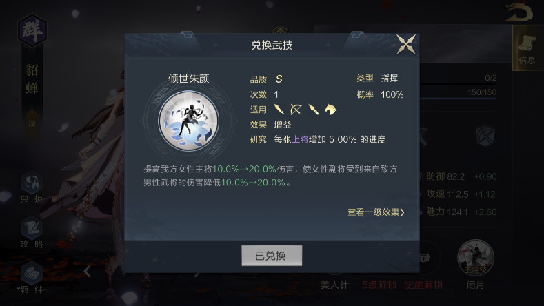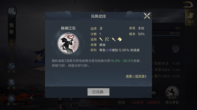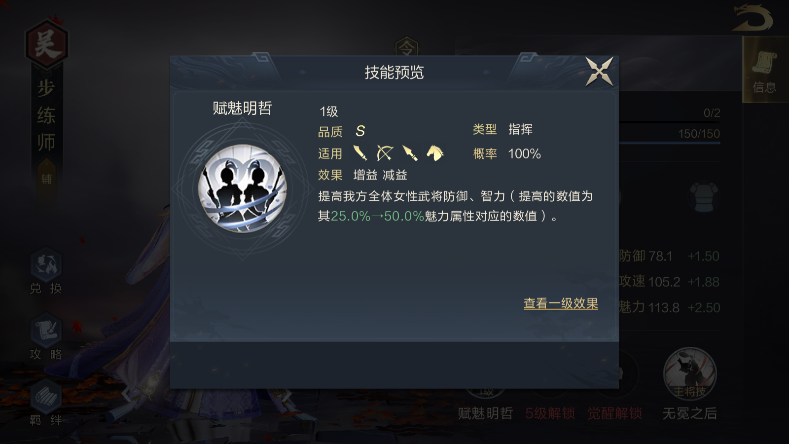 自带技能:赋魅明哲满级效果提高我方全体女性武将防御和智力。(提高的数值是对应其魅力数值的50%)