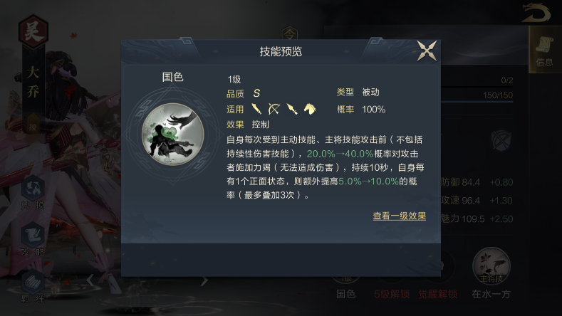一技能:是妹妹队标配的倾世朱颜,提高主将伤害为女性副将减伤。为自带技能增加一个正面状态。
