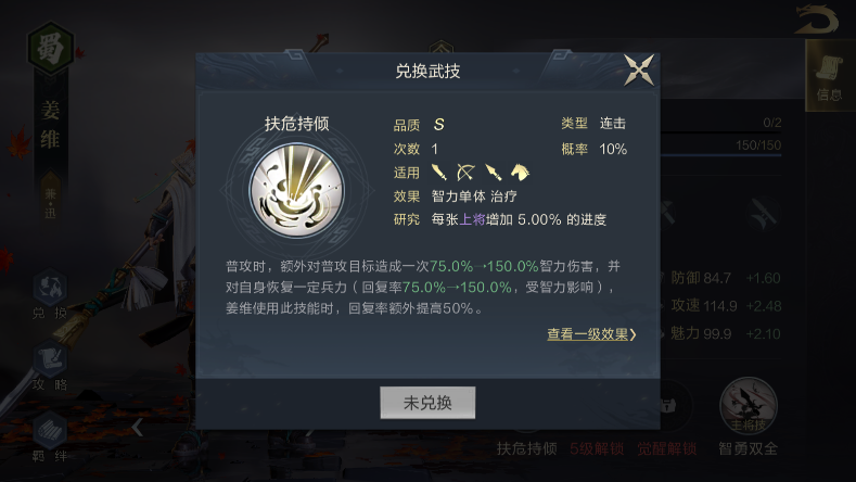二技能:扶危持倾为队伍输出伤害还可以为自身恢复一定的兵力。