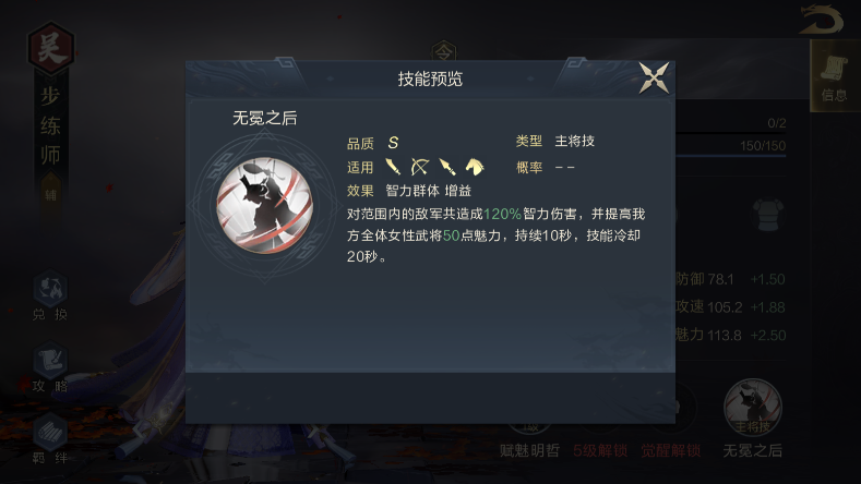 步练师(主将):主将技能无冕之后对敌方造成范围性伤害,并提高我方全体50点魅力。