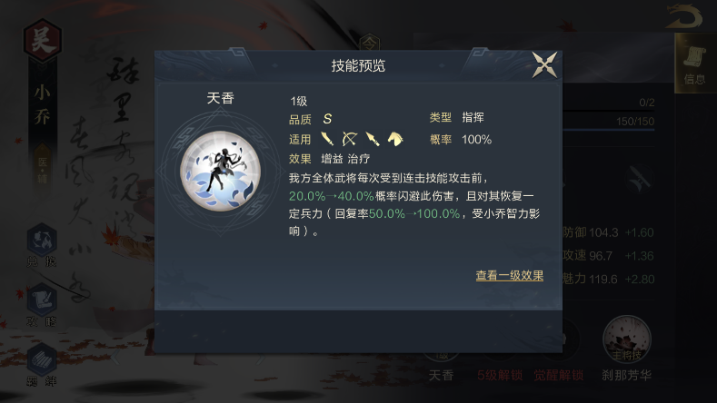 小乔(副将):自带技能天香,连击队伍的天敌,满级技能可有40%概率的闪避伤害,还会恢复自身的一定兵力(受智力影响)