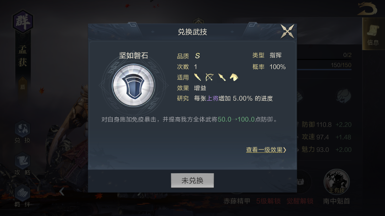 二技能:坚如磐石为全体武将增加防御为自身免疫暴击为队伍带来更持久的战斗准备。为自带技能增加一个正面状态提高力竭概率。