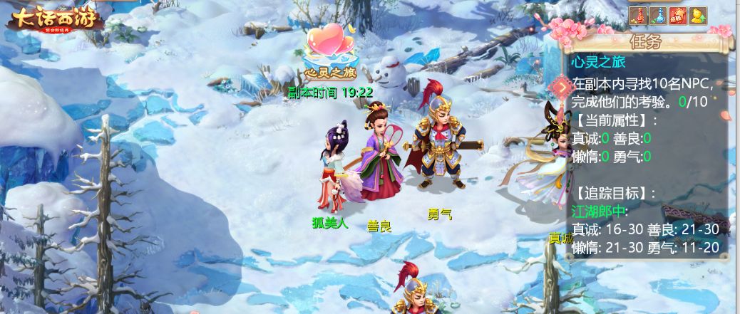 在侠士进入副本后,需要在20分钟限定时间内寻找到心灵之旅世界中的所有NPC,并完成他们发布的任务,搜寻心中的品德。任务形式多种多样,包括问答、战斗,任务失败没有惩罚,可再次进入任务直至完成,请各位少侠使用自己的聪明才智过关吧!