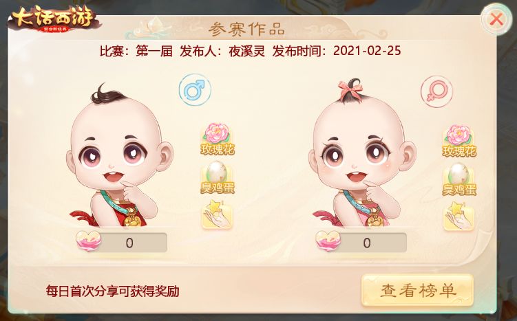 侠士将自己设计的萌娃形象分享给好友就能获得分享奖励,还可以邀请朋友为自己打榜,为自己的萌娃打造更高的人气。榜单将分为男娃和女娃两个榜单,每周四早上5:00结算,每届比赛中每张总榜前100名作品所属玩家就能获得奖励!