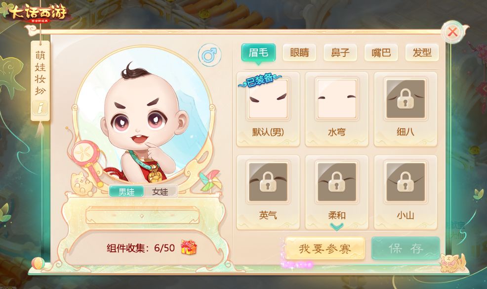 玩家可以通过活跃度奖励、绑定回流玩家奖励、老友奖章兑换等各个游戏内玩法获得萌娃各个部位的装扮,还可以和其他侠士交换多余的脸部装扮。装扮好自己的萌娃并进行保存之后,侠士就能提交萌娃形象参与选萌大赛,争夺排行榜上的排名了!