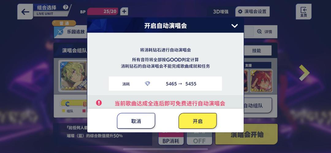 自动打歌是为了方面玩家更轻松的获取材料,但其实运用场景也就两个游戏模块:普通演唱会和合奏演唱会。普通演唱会主要是刷分和刷材料,而合奏演唱会只在周五到周日固定时间段开放,可以拿到固定的钻石和宝石,但是不及普通演唱会使用频繁。