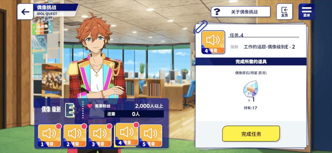 偶像梦幻祭2中提升偶像级别需要满足达标这四点要求:通用矿、人头矿、徽章以及粉丝数,前三个主要用于语音解锁,而粉丝数则是级别提升挑战任务解锁的关键。