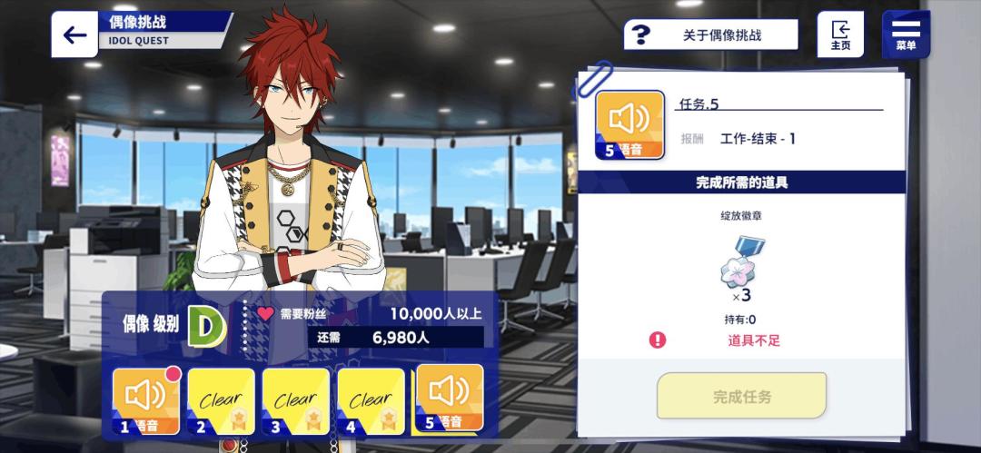 上述四个要求达标以后就能解锁级别挑战任务,任务相对简单,设定该偶像的卡片放置在组队的“center”位置,完成特定的演唱会且达到一定的分数完成打歌即可。
