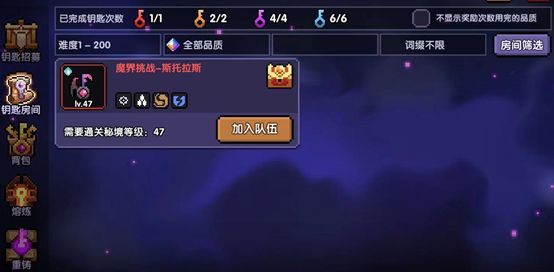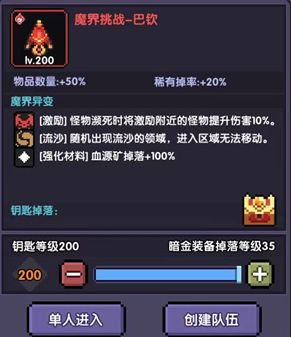 在背包里可以选择即将进入的副本等级,选好后就能创建队伍或单人快速开启魔界挑战副本。为了快速打完,这里一般拉到最低(钥匙等级不影响掉率,只影响暗金装备等级)。