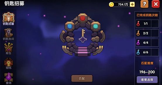 4. 熔炼:将低级钥匙合成为高级钥匙,简单来说就是4合1,蓝钥匙合紫钥匙,紫钥匙合橙钥匙是根据放进核心的钥匙产出更高一级的钥匙,而红钥匙则为随机合成,这里合成红钥匙并不会产出限定钥匙,限定钥匙需要商城购买。